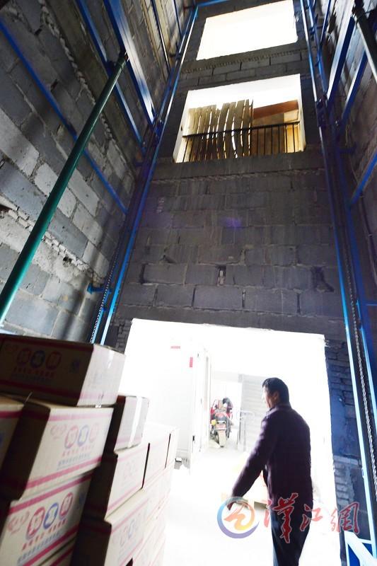 云路食品厂负责人称升降设备系房东安装,记者索要其联系方式,他又称房东曾交代不准透露。