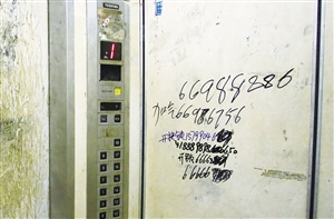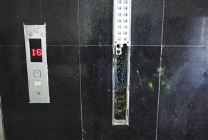 奔龙大厦旧电梯内有很多小广告,电梯多个按钮损坏。
