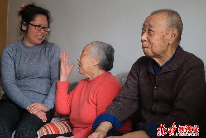 彭勇(左一)和武发年夫妇在一起。90岁的武老爷子很高兴可以老楼能够加装电梯。