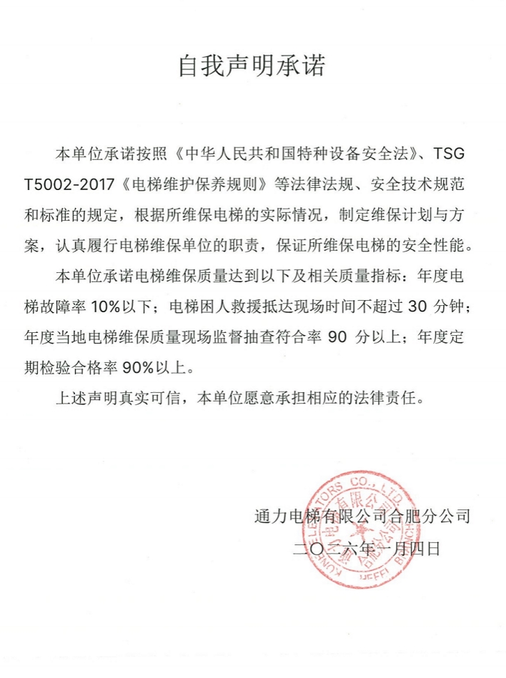 奥的斯电梯(中国)有限公司合肥分公司自我声明承诺