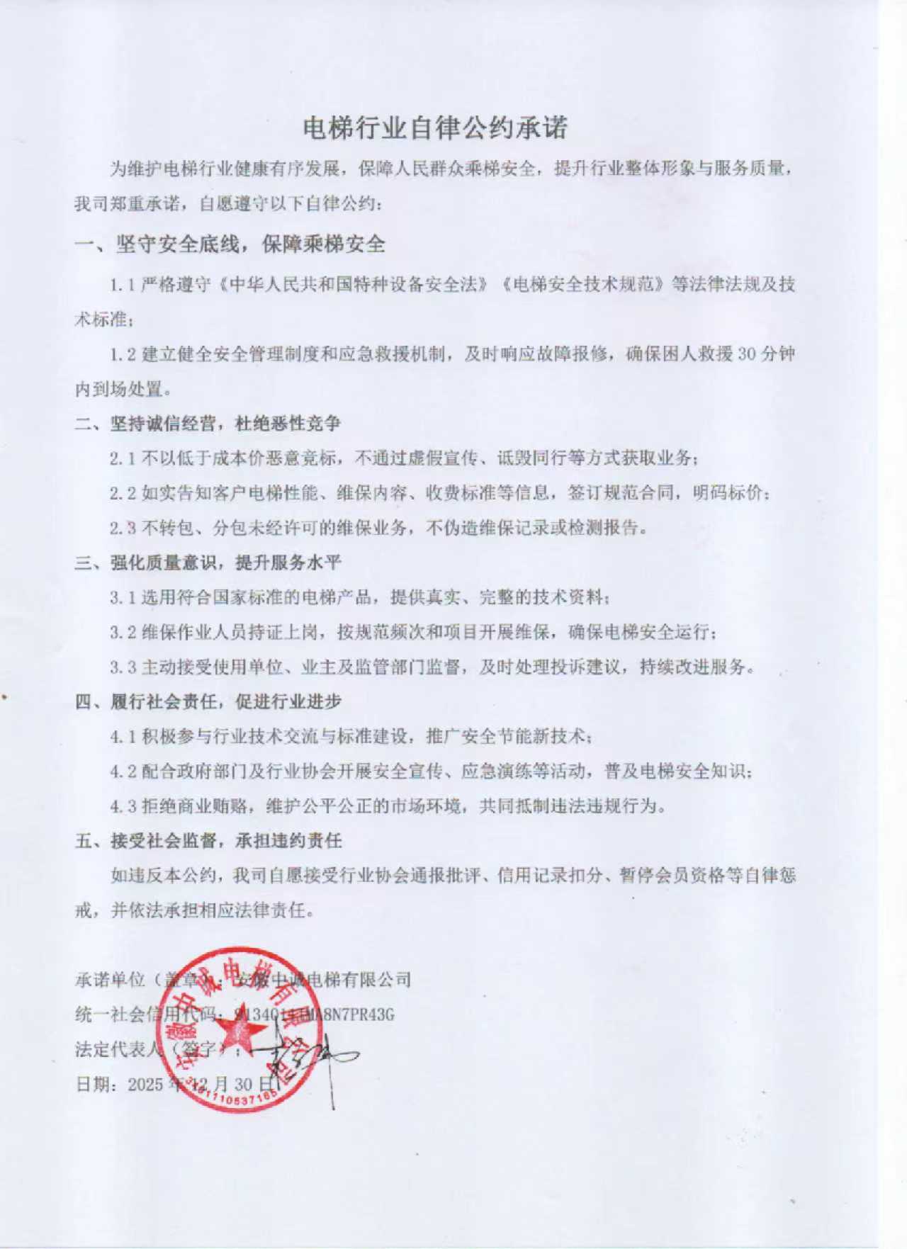 安徽省新马电梯工程有限公司关于遵守行业自律公约的承诺书