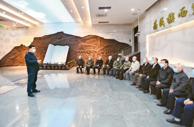 2020年4月20日至23日,中共中央总书记、国家主席、中央军委主席习近平在陕西考察。这是4月22日,习近平在西安交通大学交大西迁博物馆亲切会见西迁老教授。新华社记者 谢环驰/摄