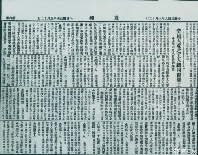 1919年6月3日以后,上海工人率先罢工,使五四爱国运动进入新的阶段。图为北京《晨报》关于上海六、七万工人总同盟罢工的报道。