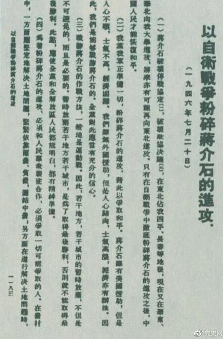 7月20日 中共中央发出《以自卫战争粉碎蒋介石的进攻》的指示,从本质上分析敌我形势,指出:我们是能够战胜蒋介石的。指示从军事、政治和经济三方面,为我党我军规定战胜敌人进攻的方针、原则和方法,并强调指出:“战胜蒋介石的作战方法,一般地是运动战。因此,若干地方,若干城市的暂时放弃,不但是不可避免的,而且是必要的。”在党中央领导下,全解放区军民紧张地动员起来,英勇地抗击蒋介石的军事进攻。