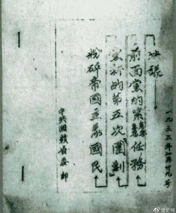 1933年7月29日,任弼时主持中共湘赣省委作出的《粉碎帝国主义国民党新的第五次“围剿”前面党的紧急任务决议》。