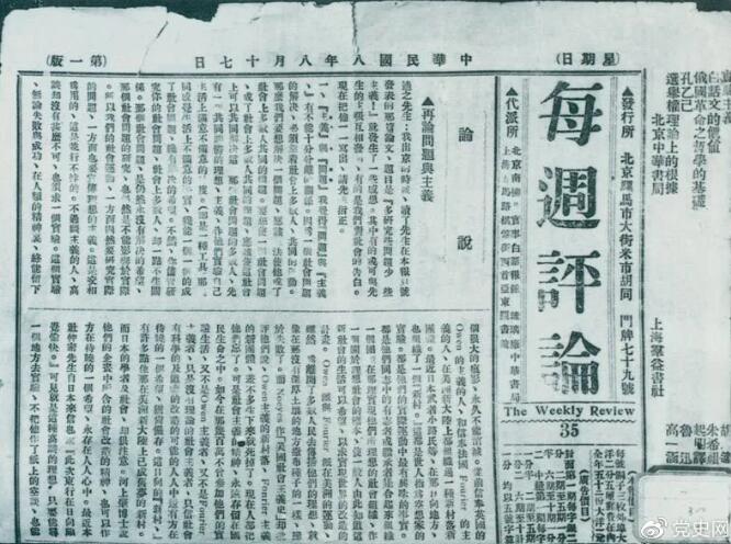 1919年8月17日,李大钊在《每周评论》第35期发表《再论问题与主义》一文,对胡适的观点作了严正的批驳。
