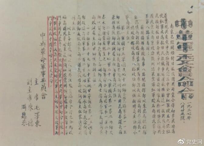 1937年8月25日,毛泽东和朱德、周恩来发出的关于红军改编为国民革命军第八路军的命令。