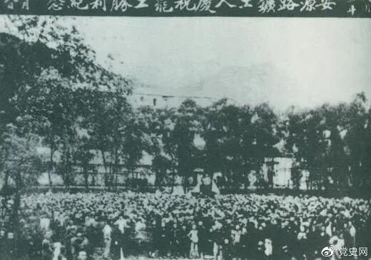 1922年9月14日-18日 安源路矿工人在毛泽东、李立三、刘少奇等组织领导下,举行罢工斗争,取得胜利。图为安源路矿工人庆祝罢工胜利。